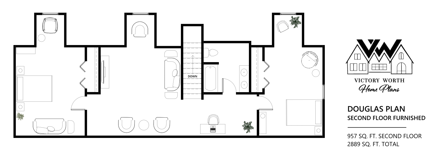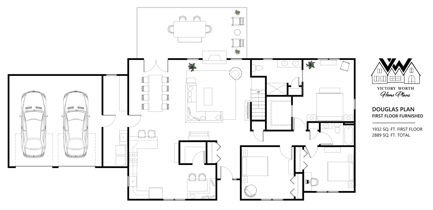 The Douglas Plan offers a spacious, casual, and open-concept living environment with ample room for gatherings. Designed to accommodate multiple residents comfortably, the plan features generously sized bedrooms and a second-floor bonus room with space to spare.
